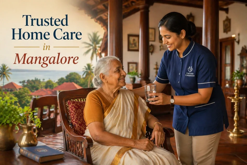 Mangalore has a uniquely high proportion of elderly residents living without full-time family support — largely because adult children work in Bangalore, Mumbai, or the Gulf. When a parent returns home from KMC, Wenlock, or Father Muller’s after surgery or illness, the question is always the same: who will actually look after them?